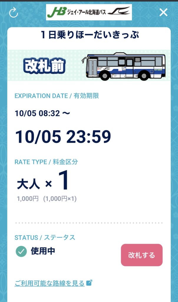 1日乗りほーだいきっぷ 金額:¥1,000 🕒 クレジット決済後1ヶ月 📍 下記のリンク参照 👤 大人•子供 ※小児は¥500 ※高速バスや臨時便には乗れない 詳細は https://www.jrhokkaidobus.com/ticket/ticket/#target02 « きっぷ一覧に戻る